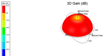 The simulation results for the WMA are shown in Figures 3-5. Figure 3 shows the reflection coefficient of the antenna, which resonated at 2.3 GHz with a bandwidth of 2.17 – 2.47 GHz. The result indicates that the antenna can operate within the bandwidth requirement of the Institute of Electrical and Electronics Engineers (IEEE 802.15.4) standard. The frequency band of IEEE 802.15.4 is 2.4–2.4835 GHz.35 The acceptable reflection coefficient for an antenna is less than -10 dB and it is at -10 dB the impedance bandwidth is measured.20,36 The acceptable VSWR (voltage standing wave ratio) lies between 1< VSWR< 2.29 The reflection coefficient for the antenna at 2.4 GHz is -12.36 dB, which is less than -10 dB. At the same time, the VSWR is 1.65, which is less than 2, as shown in Figure 4. The radiation pattern, as shown in Figure 5, conforms to the radiation pattern of a standard monopole antenna.20 The far-field gain of the antenna is 5.9 dB, as shown in Figure 6.