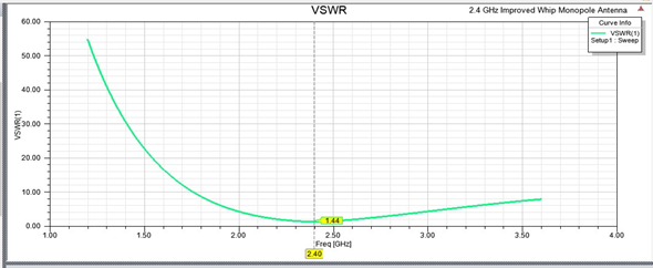 Significantly, the improved wire monopole antenna performed better in terms of the reflection coefficient and the VSWR. Reflection coefficients and VSWR tells how much of the power from an antenna is radiated and how much is reflected back. For better performance the reflection coefficient should be much less than -10 dB. It was observed that the IWMA had a better reflection coefficient compared to the WMA. It further proves that reducing the size of the antenna did not alter the reflection coefficient and the VSWR. The designed antenna can efficiently radiate at 2.4 GHz frequency and can be used in applications as TPMS antenna.