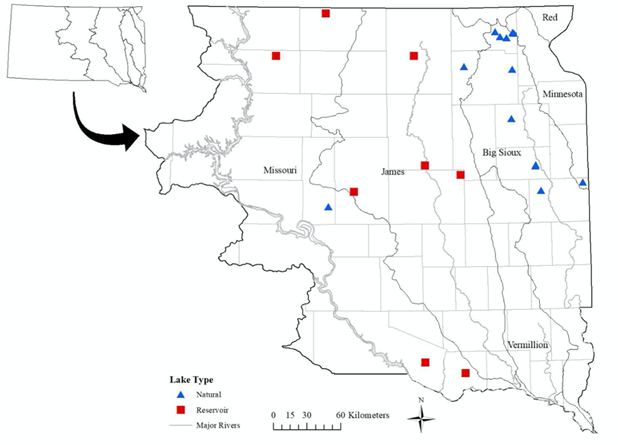 Figure 1 Locations in Eastern South Dakota natural lakes and reservoirs where Giant Floater were collected (n=21).