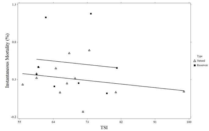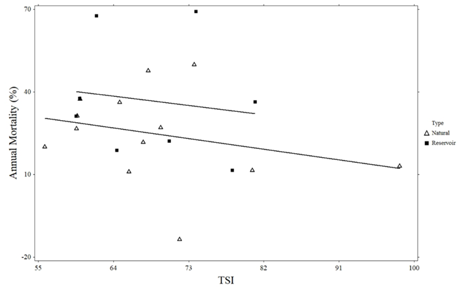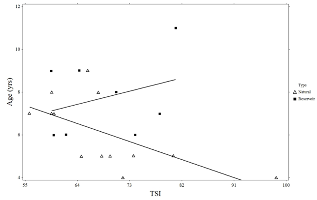 There was a significant negative relationship between Giant Floater maximum age and natural lake trophic state (R2 = 0.394, p = 0.022; Figure 3). However, no such relationship was observed in reservoirs (R2 = 0.099, p = 0.447). There were no significant linear relationships between growth, estimated length, instantaneous mortality, annual mortality, and the trophic state of natural lakes or reservoirs (Figures 4-7).