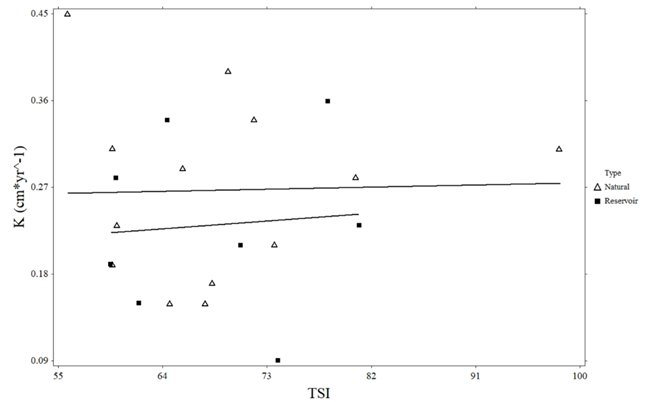 Figure 4 Linear regression of Giant Floater growth coefficient (K) and trophic state index (TSI) for Eastern South Dakota natural lakes and reservoirs.