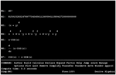 In 1979 Prof. David Stoutemyer and Albert Rich, an applied logician, founded The Software House in Honolulu with the goal of creating a small yet powerful CAS. The first products of the company were: muLISP,13 a tiny LISP dialect that could be run on small computers, and muMATH79,14 a CAS written in muLISP. The last version was muMATH83. It was a standard (for the time) command-line interface CAS. It was surprisingly tiny and the hardware requirements were very modest. But the star of the company was DERIVE, which first version appeared in 1988. It was also designed for text terminals (MS-DOS), but it was menu-driven and very comfortable to use (Figure 1). A computer without a hard disk could directly run DERIVES from the 5 1/4" distribution diskette. DERIVE 4, included both text console and Windows versions. The latter version was much improved in the next DERIVE 5. The Software House was purchased Texas Instruments in 1999 and DERIVE was discontinued in 2007 in favour of TI-Nspire, a product developed from scratch by Texas Instruments and fully documented. The last version of DERIVE was Derive 6.1 (Figure 2). It was distributed in a CD although it occupied little more than 2 MB. A brief summary of its possibilities can be found in.15
