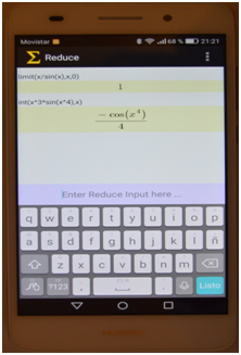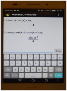 Now Maxima and REDUCE have been ported to Android OS and are freely available for tablets and Smartphones (Figures 7 & 8). Android Reduce was started in 2011 by the then student Ahmad Akra at Cambridge University under the supervision of Prof. Arthur C. Norman. Two user interfaces exist, one that makes the screen look like a calculator and another one with text input very similar to the computer version of REDUCE. Maxima were ported to Android by Yasuaki Honda, a Maxima developer, in 2012. Modern smartphones are faster and have more memory available than the desktop computers available not many years ago. Therefore, the algebraic tasks that can be faced are not neglectable, and many students carry their smartphones with them everywhere.