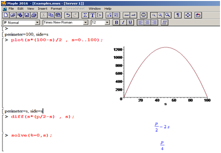 Example 2: A farmer has a fence made of pieces that can be assembled in rectangular shapes. As the number of pieces is limited, the perimeter is fixed. Is there a way to maximize the area inside the fence? It is easy to investigate with a CAS which seems to be the solution and to prove it (Figure 9). The first guess can be easily made thanks to an accurate plot, but plotting is not so easy and takes time if done by hand.