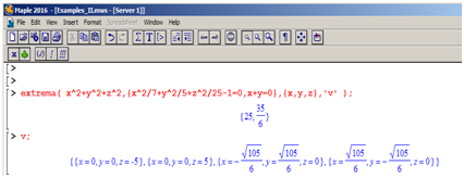 Example 6: Let us consider the following exercise: find the points of the ellipsoid lying on plane x+y=0 such that they maximize the distance to point (0,0,0). For instance, a Maple expert can realize that it provides a command that directly solves the problem, returning the extrema (Figure 11). Although not difficult, this problem takes some time to solve with pen and paper.