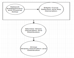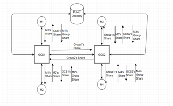 GCSs are set up and are interconnected to each other thus a network of servers is established. Group members are connected to GCSs. An elliptic curve is chosen with a generator g having large prime order q, along with some additional parameters. Individual public and private keys are conceived all members including GCSs. These keys are used for intra-group authentication purposes. After that a group key for group identification and authentication is created and is stored on a public directory. This key is used for inter-group authentication (Figure 2).
