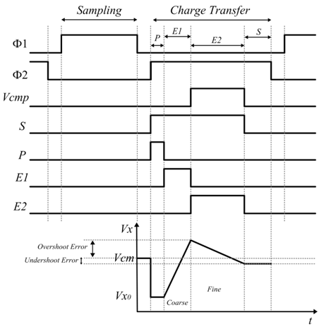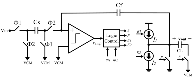 The conventional CBSCI has shown in (Figure 1) consists of a comparator followed by a logic unit which generates control signals as E1 (coarse charge transfer), E2 (fine charge transfer), S (output switch), and P (preset switch).15 E1 and E2 are applied to two linear current sources, I1 and I2 which charge and discharge the load capacitor as coarse and fine charge transfer. The timeline of this integrator has shown in (Figure 2). According to (Figure 2) during the sampling phase the input signal has sampled in Cs and charge transfer phase begin with rising Ф2. In the beginning of this phase a preset pulse is applied to the output, connecting it to the lowest voltage in the circuit. Then a coarse charge transfer phase E1 and a fine charge transfer phase E2 charge and discharge the load capacitor respectively in order to creation of virtual ground effect. During the preset phase, the virtual ground node (the comparator positive input), Vx, drop below the common-mode voltage, Vcm, and resetting the comparator. The logic control part raises E1, and I1 charges the load capacitor (output node) up to the virtual ground node equals the common-mode voltage (coarse charge transfer). At this time, the comparator set, however the load capacitor has charged up higher than proper value due to the comparator delay time. So an overshoot error has produced which shown in (Figure 2). In order to correction extra charges the logic control part pull down the E1 and raises the E2 which cause to discharges the output node by I2 (fine charge transfer) which has slower rate compared with I1, until the virtual ground node voltage becomes lower than Vx, at this time the output of comparator resets again and both of E1 and E2 are came down. Here, switch S opens by logic control part and the correct value is sampled on the load capacitor (which is the sampling capacitor of the next stage).16 The output is slightly lower than the ideal value because of the comparator delay time. This delay time produces a constant signal-independent undershoot each cycle which shown in (Figure 2). In fact we need to reach the correct output value only at the sampling instant and it doesn’t matter how it reaches there. By this procedure we are able to detect the virtual ground effect in order to removing the OPAMPs.17 This strategy helps us to abandon issues of speed, gain, and stability. Replacing the OPAMP with comparator also has significant effect to power consumption issues due to lower power dissipation of comparators in comparison to OPAMPs.18
