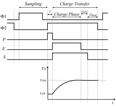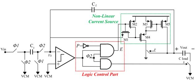 The proposed CBSCI has shown in (Figure 3) which consists of sampling circuit, a comparator, a simple logic control part and a non-linear current source. The sampling circuit operates exactly like opamp-based switch capacitor circuit which sample the input signal and hold it for charge transfer phase, also logic control part include just three simple logic gates as three inputs and two inputs ANDs and an inverter. This logic control part is specified by red rectangular in (Figure 3). Also the main important part of this circuit is non-linear current source. This current source specified by green rectangular in (Figure 3), uses the M1 and M2 as switch and a PMOS transistor to drive large current as M5. Time line of this integrator has shown in (Figure 4) which shows logic signals and non-linear charging for virtual ground creation. According to (Figure 4) this circuit works in two main phases, the sampling phase and the charge transfer phase. In addition the charge transfer phase consists of two sub phases, the preset phase and the charge phase. During Ф1, the input signal is sampled and Ф2 begin with preset phase like conventional circuit and following the unique charge phase begins, which at the end of this sub phase S switch opens so the integration is performed. This integrator can operate with higher clock frequency due to unique charge phase.19 Also the logic part is miniaturized in compare with conventional circuit which reduces the circuit size and power consumption consequently. After sampling phase and in the beginning of Ф2, the P switch closes and output node connects to ground (the minimum voltage in the circuit). This cause the Vx becomes lower than Vcm so the comparator output set to high (inputs of comparator in proposed circuit are vice versa in comparison to conventional CBSCI). At this time outputs of ANDs, S and E are high and low respectively so the S switch is close and the gates of M1 and M2 are in low voltage which makes M1 off and M2 on considering that M1 is a NMOS and M2 is a PMOS transistor. So the gate of M4 as a PMOS type connects to supply voltage which makes it off and as a result the current mirror is off. In this condition M5 don’t charge the output node. Time of preset phase depends on capacitors connected to output node. In fact the preset phase is the appropriate time to discharge output node in order to reduce the Vx to lower voltage value than Vcm. This causes the value of Vx to go below the Vcm and consequently the output of the comparator is set to high. The next step is charge phase which has the most difference in this work in compare to other works. In this phase E and S is high so S switch is close and non-linear current source is working. The gates of M1 and M2 have high voltage so M1 is on and M2 is off. The gate of M4 connected to Vx which has lower value than Vcm at the beginning. So M4 is in triode region and has a current like (1).
