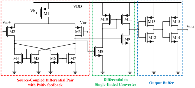 Again by charging, the Vx increases and the current of M5 decreases, so a non-linear charging system creates. This non-linear charging continues the raising Vx voltage to the point that Vx reaches above than Vcm which changes the comparator output state. At this time the comparator output sets to low and current source is off and the S switch is open. So the charge transfer phase is completed. The comparator used in this circuit plays an important role to logic part stimulation. This comparator must have high speed and high resolution in order to be efficiently applicable in the proposed CBSCI at high clock frequency. The selected comparator in the proposed circuit shown in (Figure 5) includes three major part: source-coupled differential pair with positive feedback specified by red rectangular, differential to single-ended converter specified by green rectangular and output buffer specified by blue rectangular. The first part provides high resolution due to positive feedback. Also the differential to single-ended improves the gain of first part and finally the output buffer complete output node voltage swing.