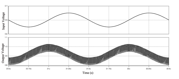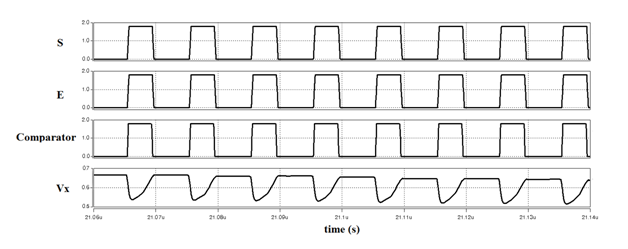 We designed proposed CBSC integrator in standard 0.18µm CMOS (Table 1) process and biased it with a 1.8V power supply voltage.20 Non-overlapped clock frequencies, i.e. Ф1 and Ф2, choose 100MHz. Also input signal is a sinusoidal wave, has 1MHz frequency and 50mV amplitude. The sampling, feedback and load capacitor are 1pF, 4pF and 2pF respectively. (Figure 6) shows the input and output signals of proposed CBSC integrator with 100MHz clock frequency.21 In addition (Table 2) is presented to show the output phase in different sampling and input frequencies. To insure the accuracy of the proposed integrator we should check the Vx voltage and control signals which have been shown in (Figure 7). In this integrator comparator output trigger the non-linear current source and logic control part. Also the output of comparator depends on Vx as shown in (Figure 7). So in charge transfer phase when Vx is lower than common mode voltage (in this circuit selected equal to 0.65V) the comparator output is high and non-linear current source is working in order to charging output node and raising Vx respectively.22 when the Vx voltage be greater than common mode voltage, the comparator output set to low, non-linear current source is off and S switch opens as shown in (Figure 7).