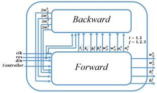 Top level is a program that combine forward propagation block and backward propagation block and we used controller to select the process. So, there are no overlapping with that two process and the system can run synchronously (Figure 1). Integration between backward block with forward block, the detailed of architecture of each block can be seen in.2