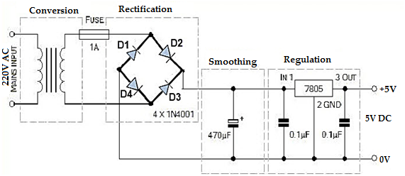 Figure 3Conversion, rectification, smoothing, and regulation of 220v ac to 5v dc for use by the microcontroller.