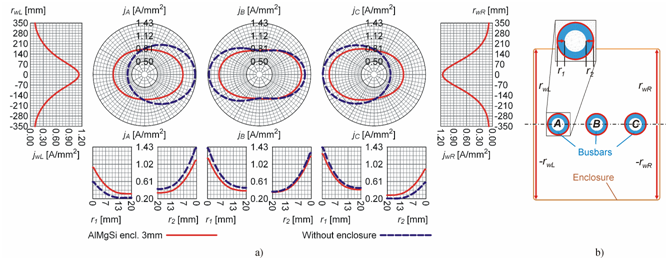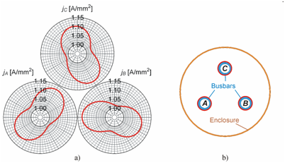 In short, even though the rms amplitudes of balanced three-phase currents are the same in all the three conductors, that is the time-average loads are symmetrically arranged, the resultant time-average power distribution is not necessarily symmetric. At least, not in the horizontal symmetry we have investigated. However, there are geometric arrangements, in which the current density distribution is symmetric even in lossy circuits. This is the case with Tevan’s28 theoretical 1D model mentioned above or with the busbars of high voltage GISs, where the circular conductors are situated in the vertices of an equilateral triangle within a circular enclosure (Figure 5b). Figure 5a represents this case, showing the current density distribution over the busbar surfaces in an Ir=3000 A switchgear.30 The distributions in each busbar are clearly identical but shifted by 120 degrees. Or only seemingly? Cannot the reason of the apparent symmetry hide within the limited resolution of the plot? Now, the sceptics could say that there can be tiny differences revealing themselves only with a higher magnification, not to mention that the similarity of surface distributions does not necessarily imply similarity over the entire cross section. These are all reasonable objections. For this case however, we let the reader prove the existence or the non-existence of the symmetry or refer to Arnold12 in this question.