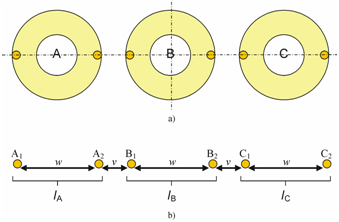 Since we are not interested in the voltage drops along the conductors, these can be easily eliminated from (1), and we can finally have k equations with k complex unknowns for the filamentary currents. If we take the amplitudes and phase angles of these currents into account separately, then we can say we have twelve real unknowns in our simple model, where p=2 and k=6 (Figure 3a). When we determine the self and mutual inductances, then the radii of the conductors cannot be zero, we have to model them as tiny pipes having finite radii. Alternatively, we can imagine them as solid cylindrical conductors with uniform current-density distribution, since these can be represented like small tubes having an equivalent radius. We assume that in our case, the condition of uniform current-density distribution is satisfied within the elementary conductors. By solving the equation system, the complex currents can be easily obtained, as well as the losses, as the resistances are known. This method is simple; IEC also recommends it for sizing single core underground cables.27 It can determine the losses both in the conductors and in the screens of cable groups consisting of several cables. By knowing the impedances of the exact cable arrangement that is, the numerical data of sizes, distances, materials and frequency, a computer can solve the equation system in the twinkling of an eye. However, the sceptics might say: “Computers make rounding errors, which can be the cause of the ‘apparently’ asymmetric distribution, and even if we accept the results as perfectly accurate, this method does not explain anything. We obtained asymmetry in one particular case, but there might not be asymmetry in others.”