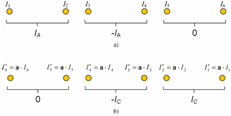 Instead of struggling with complicated impedance or admittance matrices and with the symmetrical three-phase current system IA, IB and IC (where IA, IB and IC are rms current phasors), let us connect the currents IA, –IA, and 0 on the conductors of Figure 2, just like Figure 3a shows. With this modified current system, the , , , ...complex currents will flow in conductors A1 … C2 respectively, where I1+I2=IA, I3+I4=-IA and I5+I6=0. The parameters A … F are the amplitudes of the currents, whereas α … ζ are the corresponding phase angles, and j is the imaginary unit. Now, connect the currents 0, –IC, IC on the conductors of Figure 2, as it appears in Figure 3b. It is easy to see that because of the planar symmetry, and since IC differs from IA only in a 120 degrees phase shift, the resulting current distribution will be similar to that of the previous example, only in opposite order and shifted by 120 degrees. In short, the currents , ... will flow in conductors A1 … C2 respectively, where the multiplication with represents a 120 degrees shift in time.