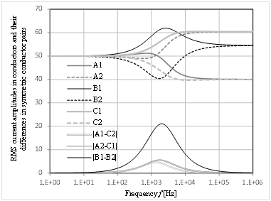 Now it is clear that the current density distribution and the time-average loss distribution are not necessarily symmetric in conductors arranged in a horizontal symmetry and loaded by a three-phase balanced current. The resistance of the conductors is responsible for the asymmetry. In solely inductive circuits, the phenomenon does not occur, explaining why asymmetry cannot be experienced in superconducting busbars with similar geometric configurations. Although at the beginning we excluded all numerical data from the proof, the correctness of our considerations can be testified by calculation examples. Let us solve the equations mentioned previously in section 3 for a simple configuration including the six elementary conductors of Figure 1b. Referring to the notation of the figure, let the parameters for our example be as follows: w=60mm, v=20mm, the radius of the solid conductors r=1mm, and the amplitude of the three-phase symmetric load current 100A, mA, or %. (Because of the linearity of the model, the magnitude and the unit of the current are not relevant here. Therefore the choice of 100% makes the evaluation of the results easier. This way, the currents of each conductor can be compared to the load current as a percentage.) Table 1 summarizes the currents distributed in the six conductors both for solely inductive and lossy circuits. In the latter case, the conductors were aluminum with a resistivity of ρ=3,36·10-8 Ωm. The frequency of the calculations was f=50Hz. By taking a closer look at the resulting currents, the symmetry is evident in the solely inductive circuit. However, the current distribution of the lossy conductors can hardly be called symmetric. It would be a bold idea to accuse rounding errors causing the differences in the currents in the latter case. It is worthy of notice that the sum of the resultant currents flowing in an elementary conductor pair forming one larger conductor is not equal to the load current. This implies a slight phase shift between the currents of the pairs. It is interesting that in this example, the difference is more noticeable in the purely inductive case. At first, some of the readers might think this fact contradicts a previous statement, namely that any of the currents must be in the same or opposing phase if the resistance is zero. There is no contradiction, since this statement holds true only for current systems 1 and 2 separately and not for their sum. It is interesting to see how the resistive or inductive character of the system influences the asymmetry. We have seen that the loss distribution was symmetric in solely inductive and dc circuits. If we fix the conductor resistances, these two extremes can be represented by f→∞ and f→0 respectively. Consequently, the easiest way to compare the differences is to change the frequency. The diagrams in Figure 4 show how the currents varied in our simple model as the frequency changed (the skin effect in the conductors was neglected even at high frequencies). It is clear that the 50 or 60 Hz of power distribution resulted only in a minor asymmetry. Maximum current–asymmetry in the symmetric conductor pairs A1–C2, A2–C1, and B1–B2 appeared at different frequencies between 1 and 2kHz.