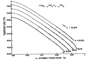Epitaxial growth of epitaxial layers of HgCdTe from liquid solutions can be accomplished from Hg-rich , Te-rich and pseudobinary HgTe-CdTe solitions. The selection and knowledge of a correct phase diagram is prerequisite issue for estimation of melt composition. There are two versions of solid-liquid phase diagrams representing Hg-Cd-Te ternary system available in the literature. These are Harman's experimental3 and Brebick's theoretical one based on his associated solution model.4 The liquidus lines in both the diagrams match well while there is a significant difference in the solidus curves. Acritical comparison of the two revealed that the Harman's diagram was established under nonequilibrium and high Hg overpressure condition which has resulted in solidus estimation biased towards HgTe rich compositions. With the determined solution composition (y,z), it is possible to calculate both the liquidus temperature and Xusing the Te-rich angle of phase diagram data given by Harman3shown in Figure 1.