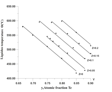 The difference between experimental results and those calculated from expression (1) using values of available in the literature reaches the markedly high figure of 5–8ºC. The reason for this is mainly related to the difference between the actual LPE growth conditions used in an each referred work and the conditions under which the data for the phase diagram was obtained. With the purpose of reducing this difference, we considered Harman’s phase diagram data and revealed that with they contain dots that, in practice, are not used for LPE growth and significantly complicate the dependence. We have excluded these dots with from consideration and obtained a new relation for solutions with by use numerical methods: