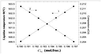 Figure 3 Run-to-run reproducibility of liquidus temperature (1) and epitaxial layer composition (2).