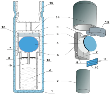 The LPE layers of (x=0.20–0.22) were grown inside a homemade tipping growth apparatus at 501–470ºC using Te-rich solution with and (L~501ºC) with the ratio of compositions of elemental sources of 6N-purity Hg, Cd, and Te in the liquid phase, , of 0.183:0.0106:0.806 (mol frac.) The solutions were synthesized by rocking at 705–710ºC in a sealed silica ampoule, followed by water quenching. The Cd0,96Zn0,04Te wafers with (111)B oriented surface were used as substrates. The LPE apparatus providing the residual-melt-drop-free surface is schematically shown in Figure 4. It comprises a quartz ampoule (1), reservoir (2) of solution melt (3), holder (4) for the substrate (5), substrate recess (6), slot (7), opening (8), and pinhole (9) in the holder, quartz wafer (10) with scribe capillary marks (11) on its surface, pin (12) for fixing the quartz wafer, pin (13) for fixing the substrate onto the holder, cap (14) for dipping the substrate, and ampoule plug (15).