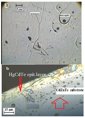 Figure 4a shows some typical morphological features of as grown epilayers. The epilayer morphology shows terracing patterns and micropits/voids. The later are originated from Te inclusions usually existing in CdZnTe substrates. The typical diameters of Te inclusions are 1-2µm, although sizes up to 100µm are observed in high-pressure and vertical-Bridgman grown CdZnTe wafers.6 The microphotograph of cleaved 15µm thick HgCdTe epilayer with planar substrate–epilayer interface is shown on Figure 4b.