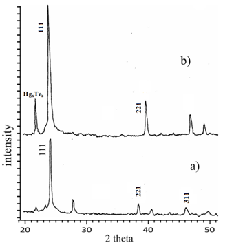 The XRD spectrum of as-grown and annealed epilayers are shown in Figure 5a & Figure 5b, respectively. Some special diffraction peaks appeared in both XRD spectra at 23.7ºC, 38.5ºC and 46ºC, which gave crystalline HgCdTe a (111), (220) and (311) preferential orientation. As per ASTM standard7 those peaks corresponds to the interplanar spacing of 3.74Ǻ, 2.35Ǻ and 1.97Ǻ. This means that the HgCdTe films have a face-centered cubic (fcc) structure, which has the lowest energy on the (111) plane. Apart from those peaks, there are two additional peaks appeared at 22ºC and 28ºC as well. The first one corresponds to the interplanar spacing of 4.15Ǻ little-studied HgxTez compound phase existing in the epitaxial layer (as per “ICDD PDF-2 Release 2003 of the Powder Diffraction File). The second one, corresponding to the interplanar spacing of 3.18Ǻ wasn’t recognized, however this was annealed out. The intensity of the X-ray diffraction maximum is increased by a factor of 3 after annealing. Meanwhile, it needs to be noted that, despite the position of the peak at 23.7ºC relating to the main cubic phase (111) remained as is after annealing , the diffraction peaks at 38.5ºC and 46ºC relating to the minor phases of (220) and (311) shifted to a higher diffraction angles. A such shift is usually observed when comparing of XRD spectra of of Hg0.8Cd0.2Te and Hg0.7Cd0.3Te volume single crystals. While increasing of x from 0.2 to 0.3 the interplanar spacing decrease from 6.46Å to 6,40Å respectively. The decrease in 2θ of these peaks may be related to changes in lattice parameters of epitaxial layer. This is because of partial evaporation of Hg from epilayers that lead to decreasing of Hg and increasing of Cdx during annealing and redistribution of their composition.