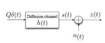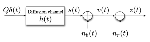 Consider the diffusion –based noisy channel of Figure 3; where at time zero ,Q number of messenger molecules are propagated through the diffusion channel of impulse response h(t). Let n(t) be the sample function of a noise random process N(t) , then due to the nature of the channel ,that is the diffusion channel ,it is not hard to see that we may be able to consider two different types of noises .That is nb(t) and nr(t) are being the Brownian and Residual noises respectively (Figure 4).