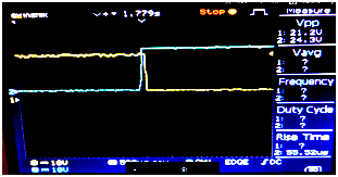 Test and results: A series of tests have been conducted and the result obtained is presented in Figure 3. The switching between two sets of accumulators is presented for a discharge limit of 21.2V; the response time obtained is 55.52µs as we can see from the oscilloscope captured screen of Figure 3.