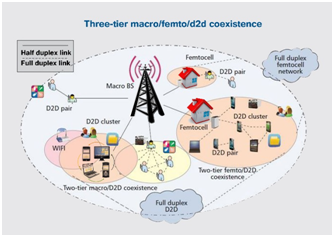 FD allows user segment to send and receive signals at the same time over the same frequency. Also, FD overcomes several drawbacks of wireless communication systems. Additionally, FD enhances SE for cellular networks20 as well as offers high transmission data rates. Moreover, it overcomes traditional transmission modes such as half duplex (HD), BW constraints. In addition to mitigation for any division duplex, it reduces the hidden terminal up to 88% and increases link capacity. Let us now take an example to consider one network consisting of three nodes X, Y, and Z. Both nodes X and Z are out of each other meanwhile both of them sending packets at the same time to node Y. These nodes can’t detect a collusion that will occur, which demonstrate that FD can enhance the collusion detection among the network. Device to device (D2D) communication in heterogeneous networks is considered as one of the ultimate goals of FD in 5G, as Figure 4 illustrates. D2D permits user equipment such as mobile phone or any devices to communicate with other devices in short distances on requiring that low power consumption without routing to traditional base station (BS). The traffic routing in D2D communication should be off loaded from macro base station.21-23 Based on predicted higher data rate that will be offered or applicable as a result of evolution sequences, we should introduce this newest type of communication. Since D2D can successfully be accomplished without routing to macro BS as in conventional mobile systems, such scenario will generate one important issue which is how to charge or bill this type of service and how network providers deals with this scenario.