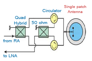 Passive SI improvement: In passive algorithm, suppression can be implemented through three antennas; two for input and one for output (MISO). Placement of transceiver antennas on the same device employs major and effective solution to attenuate the power of SI.32 Figure 6 depicts the restoration of this technique which can be realized by considering two antennas for transmission, with calculated distance of separation "d" and “d+λ/2” far from receiving antenna, and one at the receiving end. The two transmit antennas can attain null position which means that the two waves are offset. In other words, the transmit antennas will add destructively to cancel out each other, causing a null position where receiving antenna receives a much weaker signals.Passive technique can offer suppression for SI in the range of 20-30dB.33 On the other hand, passive suppression with three antennas has some problems and limitations such as the request of three antennas and difficult far field effects that doesn’t adapt to environment. By integrating the single antenna with two feed points, as shown in Figure 7, the antenna has the capability of propagating and receiving signals with polarization diversity. It is important to note that the feeding points are orthogonal and have the same amplitude. This type of SIC can offer isolation up to 40dB. The proposed technique has three major motivations as improving the power efficiency, overcoming limitations of FD communication and reducing interference between wireless devices. To achieve more improvement for SI, we should implement the above techniques with both RF and digital cancellations which results in active category of cancellation.