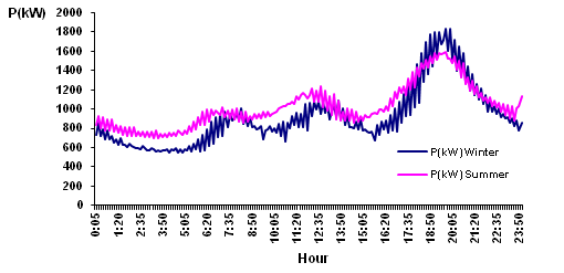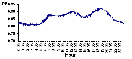In Cuba there are two normed schedules, winter and summer. The winter schedule extends from November to February, and summer time remaining months. DST is implemented for better use of sunlight, and this establishes a difference between the demand curves. In the summer time, the demand curve is substantially greater than the winter curve from 0: 00-17: 00h. From 17:00pm until the end of the day, demand in the summer is lower than the winter. In winter the minimum demand value is 550.67kW, and the maximum value 1833.00kW. In the case of the summer demand curve, the minimum value is 702.83 kW and the maximum value reaches 1587.50kW. In this circuit there is permanently a current unbalance between the phases. The C phase is the most loaded throughout the day, and phase B has less load with respect to phase A but with a small difference and at various times practically overlap. Day mean values are: IA=48.0A, IB=47.06A and 51.53A. IC=regarding these values average standards for distribution systems, which expresses met the unbalance It should not exceed 5%. The power factor of an electrical system indicates the degree of utilization of energy. In the case of residential circuits because of higher power loads are resistive character implies that the power factor rises and shop to 1. The graph in (Figure 2) the average power factor values are appreciated circuit analysis.