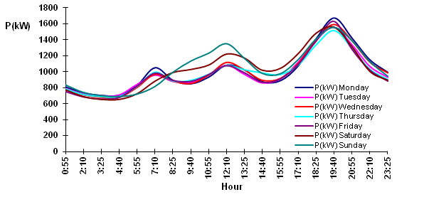 Day of the week: The same analogy can be intuited that electricity demand made at the same time in different days, it will also be different. Thus the demand for a Wednesday at eleven o'clock probably will not match held Sunday at the same time. (Figure 3) also appears every working day have a profile very similar lawsuit, except Thursday between the hours of about 12:00 to 14:00 h energy consumption is a bit higher compared the other days. On weekends seen as the same time detected pattern it is not repeated consumption on weekdays, overall the average consumption is much higher. For the model to be able to identify the load profile associated with each day of the week should include a variable that collect this effect. This variable will be coded as: