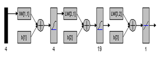 Month of the year: Depending on the month the average demand diarito vary significantly. This is mainly due to the effect of the seasons. In the winter months, regardless of climate impacts already considered (mainly temperature), it has fewer Daylights and people tend to spend more time at home. Regarding the summer power consumption can also experience a significant increase resulting from the use of air conditioning systems. It has been found that the demand curves winter and summer reach maximum values and different behaviors. Therefore it is included in the model a variable that collect this seasonal component of electricity demand. This requires a categorical variable; whose values represent the different months of the year will be used. This variable is encrypted by assigning values that go from January=0, until December=11. Initially, for an approach to the behavior of demand, parametric modeling was used, for which the identification tool Mat lab was used. The entire set of models of this tool was tested to obtain the best result of approximation by a self-regression to the following ARX structure: 25 [25 25 25 25]. It is a polynomial of high order with an adjustment of a 54.13% adjustment. Given this result, it was decided to choose another modeling tool, in this case the RNA. To predict demand by RNA, a network of feed-forward back propagation type was selected, with a training function trainlm type, formed by three layers of neurons. The first layer comprises four neurons logsig transfer function. The intermediate or hidden layer comprises 19 neurons logsig transfer function. The third layer or output is formed by one neuron or type PURELINE linear activation. Training for gradient descent method with back propagation back and with time was used. Schematically this model that provided the best results shown in (Figure 4).