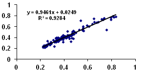 Determining the optimum number of neurons in the hidden layer it is made by a process of trial and error, ensuring the best correlation between the output data resulting model and measured values. In any case, the goal was to provide the network with an adequate number of neurons in the hidden to be able to learn the characteristics of possible relationships between sample data layer. Taking advantage of the properties attributed to the unidirectional RNA is necessary to approximate the load curve, given the available data set, later to make predictions about future values. The input variables used in modeling correspond to the time of day, day of the year, the month of the year and the season (summer or winter). Given the level of disaggregation required (h values), obtaining data series concerning the electric charge has been a particularly laborious task. This was obtained through readings NU-LEC (measuring device and protection) located in the substation under study. All series are in hourly averages, covering the period between 0:55:00 on Sunday October 7, 2007 and 23:55:00 on Sunday 30 September 2008. This makes available a total of 6893 observations, of which 1608 will be used in training the network, being reserved for other observations 1608 model validation. Observations for training and validation were selected properly so that cover data input variables extended by every month. This learning model was established approximately 75 iterations. Learning ability was estimated by comparing the training set and real-time data for different numbers of neurons in the hidden layer. An amount of 19 neurons in the hidden layer is selected finally, as was the value that gave a best combination of these data. After 1000 iterations, the network reached a mean square error of 0.0016. The neural network based model, has a correlation coefficient of 0.94 between the values predicted by the neural model (x) and the measured values (y) see (Figure 5). The values shown are normalized between 0 and 1 a recommendable for learning work element.