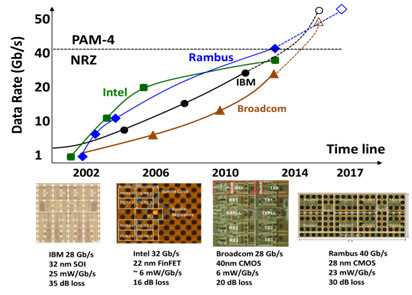 We are at a historical cross road in technology roadmap where the numbers of objects connected through internet have vastly outnumbered the human network. This network of smart objects, also known as IoT, will shape our life in the next decade and beyond. By 2020, the number of smart objects is expected to reach 100 million sending massive information over internet. To accommodate such user demand, data centers are also evolving both electrical and optical links are adopting complex modulation schemes. Eventually the need for higher speed from the users, service provider and equipment manufacturer motivates the researchers to push the limit of semiconductor device physics and communication theory. Ultimately, the end product is a fully integrated monolithic solution capable of transmitting and receiving terabits of information. Few example of such market driven R & D development efforts are given in Figure 1. While the particular development trend in each company may vary based on their business strategy, one consistent trend is the rapid increase in data rate over time. Figure also includes example work from these efforts and that also capture underline motivating factors: