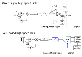 All these challenges motivate us to rethink the equalization strategy as well as receiver architecture. Recently ADC based architectures are gathering interest to enhance performance through digital processing. Therefore, in ADC based receivers where equalization is done digitally, can take advantage of the technology scaling, enables advanced equalization that can compensate higher loss compared to traditional mixed signal equalization. However, the challenge in this architecture is the front-end ADC that consumes significant power to provide the required resolution. When compared to traditional mixed signal receiver, ADC based solutions’ power consumption is 2x higher.6-13 Fortunately, recent trend is to improve their energy efficiency significantly, most of those are enabled through academic research and development that allows flexibility for disruptive approaches (Figure 5). Given the strict energy efficiency target, application of ADC based links depends on successful adoption of these techniques.