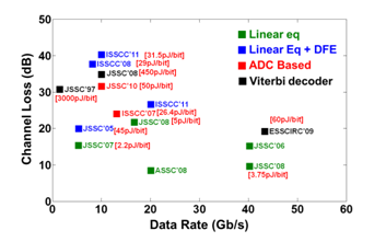 In high-speed wireline transceivers, the frequency dependent channel loss is the main source of inter-symbol interference (ISI). In simple word, ISI is the residue of the current symbol that affects the following symbols (pre-cursor) as well as the previous symbols (post-cursor). For high loss channel, conventional receiver designs usually feature analog linear equalization techniques such as continuous time linear equalization (CTLE) and passive equalization at the front end as shown in Figure 3. In addition, decision feedback equalization (DFE) and feed-forward equalization (FFE) techniques are used for further ISI cancellation and bit detection. Fundamentally, this limitation is coming from degradation of low signal-to-noise and signal-to-crosstalk ratio that is unavoidable in existing equalization techniques. Analog mixed-signal solution in general can equalize with excellent energy efficiency (around ~3pJ/bit).3 But these solutions have their limitations: first, SNR degradation CTLE that generally inverts the channel also amplifies noise, including crosstalk noise and degrades SNR. Second, the linearity requirement scaled supply reduces maximum achievable linear swing. Third, process variation makes it very difficult to achieve reliable control over zero and pole frequencies to achieve the desirable frequency response. All these factors limit the performance of existing equalization techniques and ultimately our demonstrated capability of equalization is limited to 40 dB (Figure 4).