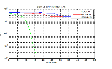 (Table 3) shows the BER performance by varying signal to noise ratio. It shows that the OFDM-with-ANN provide BER approximate 10^=-9 and conventional OFDM require BER 10^-4.