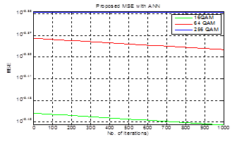 (Table 4) shows, MSE performance by varying the number of iterations. It shows that the Proposed OFDM by using M-QAM modulation require minimum MSE as compare to conventional OFDM without ANN.