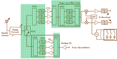 Figure 1 Block diagram of a multi-band wireless transceiver. The components in the colored blocks can be implemented through RF-MEMS Technology.