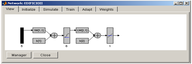 A neural network whose first information was obtained from the above table was designed: the network had five input variables given by the number of lamps, burners, televisions, refrigerators, fans (hidden layer 6 neurons activated by the function logsig)4 and, as only want to know the electric power consumption in KWh, the last layer possessed a single output neuron with PURELINE function. The display of this network is shown in Figure 1 and the graph of network training is shown in Figure 2, where it was proposed to achieve results with zero error (goal=0), among the variable TARGETII.