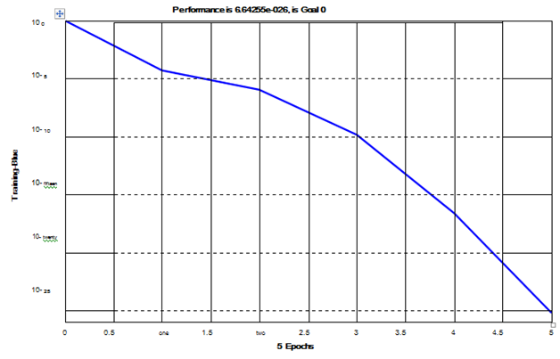 Target introduced as the training and the result of calculation of the net. As seen in the chart training after iterations scheduled training has converged showing behavior 6.64255 e-026 achieved on 5 times (Figure 1 & Figure 2). The rest of the program contains sections to observe the behavior of the network at all points of training and standardized training variables to simulate and predict behavior in the next year.5
