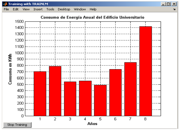 LAMPARASN=LAMPARAS/max (LAMP); BURNERS HORNILLASN=/max (BURNER); TELEVISORESN=TVS/max (TVS); REFRIGERADORESN=REFRIGERATORS/max (REFRIGERATORS); VENTILADORESN=FANS/max (FANS); VENT=[LAMPARASN HORNILLASN TELEVISORESN REFRIGERADORESN REFRIGERADORESN]'; TARGET=KWhN'; % Variable section is selected to perform training: VESIMII=VENT (1: 5.1: 6); TARGETII=TARGET (:, 1: 6); % Variables and simulation output. Red FFB predictor LAMPARASS=LAMP/max (LAMP); HORNILLASS=HORN/max (BURNER); TELEVISORESS=TV/max (TVs); REFRIGERADORESS=COOLING/max (REFRIGERATORS); VENTILADORESS=FAN/max (FANS); VSIM=[LAMPARASS HORNILLASS TELEVISORESS REFRIGERADORESS REFRIGERADORESS]'; % VENT, from first to fifth row and the sixth column to VESIMII low=VENT (1: 5.1: 6); TARGETII=TARGET (:, 1: 6); Historical Simulation EDIFICIOII% by OUTPUT=sim (EDIFICIOII, VENT) * max (KWh); Y = [OUT (1: 8)] '; % Graph bar (Y, 'r') grid on
