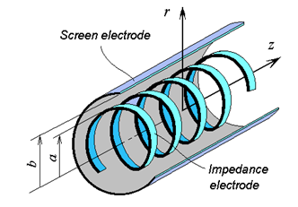 Figure 1 Helix (impedance electrode) in a metal cylinder (screen electrode).
