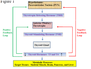 Figure 1 Flow-chart Illustrating Hypothalamo-Pituitary-Thyroid Axis and Feedback Loops: The hypothalamo-pituitary-thyroid axis begins from paraventricular nucleus (PVN) of hypothalamus producing thyrotropin releasing hormone (TRH) that causes thyrotrophs from anterior pituitary to release thyroid stimulating hormone (TSH) followed by secretion of thyroid hormones (T3 and T4) from thyroid gland. The positive feedback loop is initiated with decrease blood levels of thyroid hormones that results in increased production of TRH from hypothalamus and subsequent increase in TSH from anterior pituitary and thyroid hormones from thyroid gland. The negative feedback loop is initiated with increase blood levels of thyroid hormones which results in decreased production of TRH from hypothalamus and subsequent decrease in TSH from anterior pituitary and thyroid hormones from thyroid gland. Thyroid hormones (T3 and T4) upon releasing in the blood stream from thyroid gland regulate metabolic process by targeting several organs and tissues such as skeletal muscle, brain, pancreas, and liver.