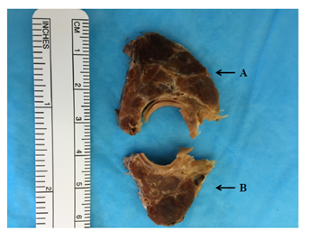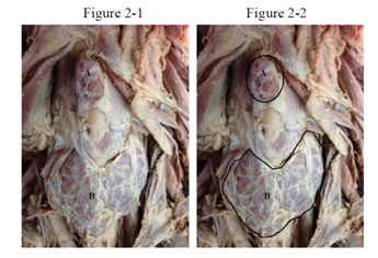 Figure 2 Thyroid Gland along with Ectopic Thyroid Tissue (Anterior View); A) Ectopic Thyroid Tissue, B) Thyroid Gland.