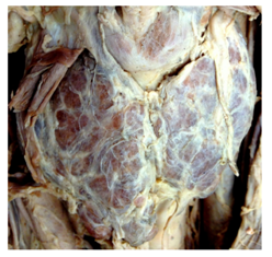 During routine dissection of a female cadaveric body, ectopic thyroid tissue was found in the midline adjacent to the hyoid bone. The ectopic structure was oval in shape and measured 2.2 x 1.6 x 1.0 cm (Figure 2) (Figure 3). The inferior edge of the ectopic gland measured 10.2 cm from the superior margin of the thyroid isthmus. A thyroid gland of normal size and location was also present. The right lobe measured 5.0 cm x 3.2 cm x 3.4 cm and the left lobe measured 4.0 cm x 2.5 cm x 2.8 cm (Figure 2) (Figure 4). The isthmus was unusually wide, measuring 3.7 cm superior to inferior. There was no evidence of a pyramidal lobe. The external surface was red-brown with a normally lobulated appearance that matched that of the ectopic gland. The serial sectioning demonstrated normal fibrous septa that divided the gland into lobules measuring 1 to 2 cm in diameter (Figure 5). The appearance of the glandular parenchyma was unremarkable with a solid homogeneous red-brown cut surface with no nodules suggestive of goiter and no gross evidence of neoplasia.