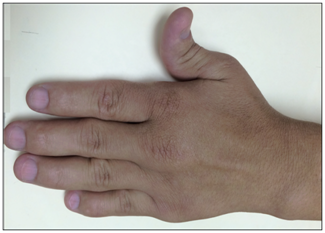Physical examination revealed an overweight male with a BMI of 29.2 Kg/m2, height of 180cm (71 inches), enlarged nose, lips, splayed teeth, coarse facial features (Figure 1), macroglossia, enlargement of both hands (Figure 2) and hyperhidrosis of his palms. Ophthalmologic evaluation revealed left nasal hemianopia.