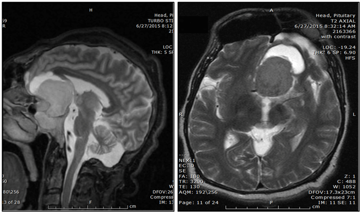 MRI of the brain (Figure 3) showed a 4.3 x 3.8 cm pituitary macroadenoma with extensive suprasellar extension and optic chiasm compression. He was evaluated by neurosurgery, but the patient refused any surgical intervention.