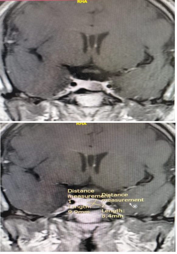 The patient was followed closely for a few months postoperatively, and his TSH level dropped to 2 (normal range: 0.34–5.6 μU/L), free t4 was 0.9 (normal range: 0.7-1.8 ng/dl), and his heart rate was 76, so the beta blockers were stopped gradually. The rest of the anterior pituitary hormone levels were within normal, and subsequently, all of his symptoms have subsided.10 So an endocrinological remission was achieved.